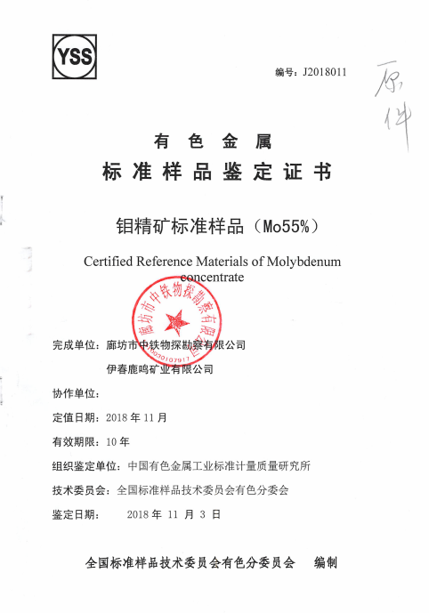 鉬精礦國(guó)家標(biāo)準(zhǔn)樣品鑒定證書(shū)及實(shí)物